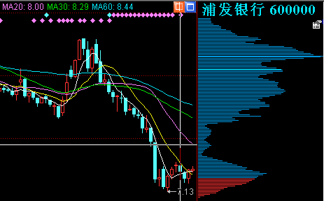 彩色的成本分布线,显示套牢盘和获利盘,显示成本集中度,直观显示当日新增成本。图中右半部分柱状图的长短反应了光标停留的那一天,分布在各个价位筹码的多少。红色表示获利的筹码,蓝色表示套牢的筹码。具体的说明参见“筹码分布及火焰山”。