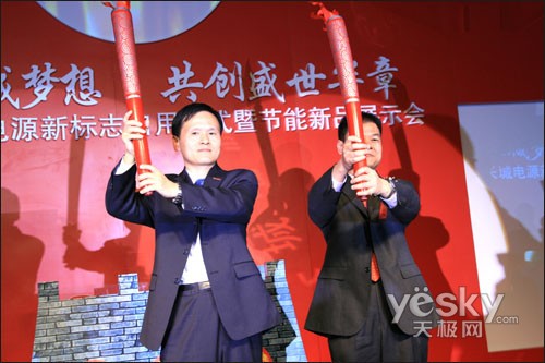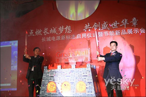 长城总裁周庚申以及长城副总裁、长城电源总经理于吉永联手启动了长城电源新标识的瞬间。