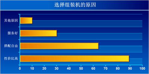 而就我们在卖场中向消费者所做的调查来看,倾向于购买品牌机的消费者就认为,品牌机的服务好,而且质量比较有保证,特别是自己不懂电脑,买品牌机比较放心;而倾向于购买组装机的消费者则是认为,组装机的性价比高,明明白白消费,按需搭配,非常个性化。