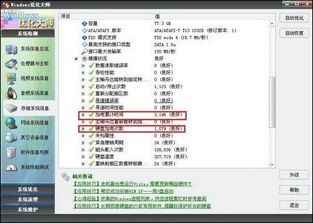 对于二手笔记本的选购,或者存在可能被二手硬盘“调包”的隐患,用户可以利用“Windows优化大师”进行进一步的甄别:在刚才打开的硬盘信息面板中,用户展开“健康状况”子分类信息,这时软件又会即时检测硬盘更加详尽的健康状况信息,包括数据读取错误率、寻道错误率、寻道时间性能、主轴马达旋转性能、硬盘吞吐性能、启动/停止次数、重新分配的扇区数、硬盘加电累计时间、硬盘加电次数、硬盘磁头载入次数和硬盘当前温度等,这些都是可以综合反映硬盘健康状况的重要技术指标,如果有一项存在瑕疵,用户都需要格外的慎重。事实上,在这里像“硬盘加电累计时间”和“硬盘加电次数”两项指标,对于二手笔记本硬盘,立马即可让其“现原形”(如图4)。