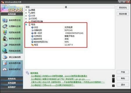 用户在欲购买的笔记本上安装和运行“Windows优化大师”,然后依次选择“系统检测→其它设备信息”选项,这时用户即可在软件主界面右侧的检测信息面板中实时看到有关电池的电池状态、设备名称、唯一标识、化学成分、剩余使用时间和剩余放电百分比等相关信息(如图2)。