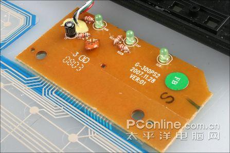 其实键盘防水最危险的地区是指示灯的位置。这些部分的防水是最弱的,而且也不可能用其他防水元件代替。在这个位置双飞燕采用了麦拉片的设计进行完全的防水。同时该电路板更有特殊的防水处理,我们在下一页有详细解释。