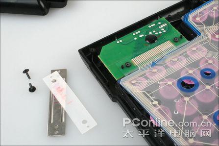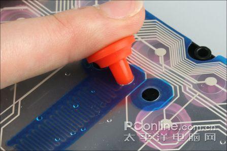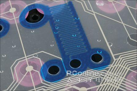封胶薄膜电路有一个“透气孔”,这是用来保证正常工作的稳定性之用的,在上图我们能够很清楚地看到。而既然是“透气”,则存在进水的可能。因此对于如水洗键盘等对防水效果要求较高的操作中,键盘的说明书也提出最好用深水塞把这个透气孔闭合。
