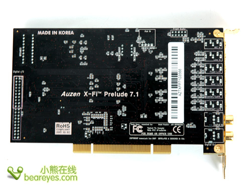 Auzen X-Fi Prelude 7.1的PCB上还设计了Front Panel Audio。标准10脚Front Panel Audio接口连接电脑机箱上的耳机输出、麦克风输入。