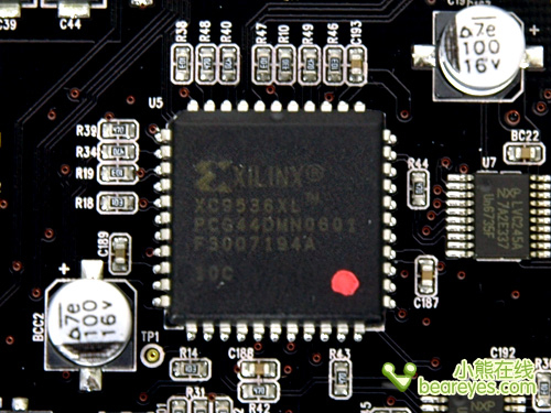 这是一颗高性能的CPLD,所谓CPLD就是复杂可编程逻辑器件,它的型号是XILINX XC9536XL。在声卡上使用CPLD可以实现一些复杂的功能,配合软件还具有可升级的的能力。