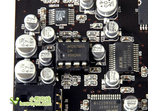 Auzen X-Fi Prelude 7.1前置左、右声道由一颗LM4562NA的运放来负责,采用了可由用户更换的设计,有兴趣的玩家还可以DIY一下这款声卡。LM4562芯片具有极低失真率、低噪声、高速、广阔的操作电压范围以及高输出功率等优点,性能之高是前所未有的。由于这款运算放大器具有这些优点,因此最适用于专业级及高端的音频系统,如音像系统接收器、前置放大器和混频器以及各种不同的34V医疗成像系统及工业设备。