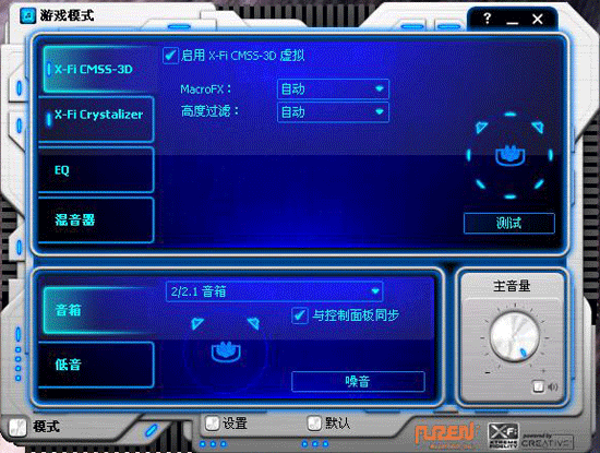 另外一个驱动界面做的非常酷,给人一种强烈的视觉冲击,这个界面下可以操作全部声卡的功能,并且可以测试连接方面的情况,同时两个操作界面都是中文的,这里就不废话了,省时省力。顺便提醒下大家,蓝色驱动界面那张图的左下角点击“模式”,就会出现三种模式的选择界面了。总之,Auzen X-Fi Prelude 7.1声卡做的非常的全能,不论是硬件方面还是软件方面都体现出来。
