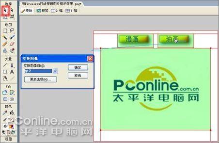 十八、使用选择工具,将油画切片中心拖拽到位图切片区,并在弹出的交换图像中选择帧2,如图18所示。