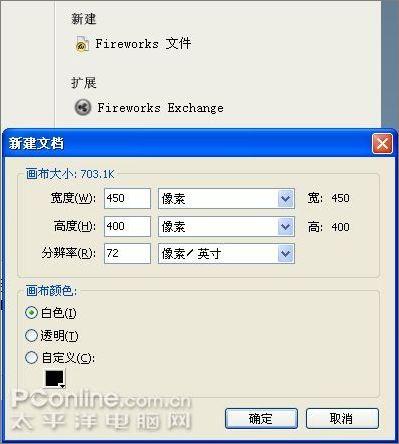 一、点击:文件—新建命令,设置宽度为450像素,高度为400像素,分辩率为72像素,如图1所示。