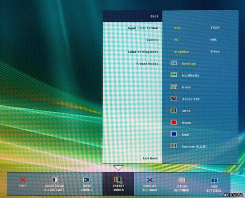在OSD的Preset Mode情境模式下有很多可以选,预设是Desktop,使用PC的2.2 Gamma值。Color Setting Mode有Graphic和Video两种模式,Graphic是给计算机用,Video则比较针对播放器或游乐器的调整,如果在模拟讯源下,情境模式调整会变成Video的项目。