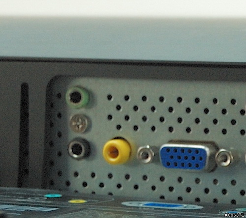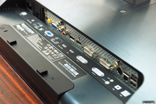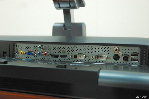 3008WFP惊人的端子界面,从左到右共计有:5.1声道输出、D-Sub、色差、DisplayPort、HDMI、Dual Link DVI x2、S-Video/Composite、USB串接孔、USB Port x2。除了没内建TV Tuner之外,很难找到第二台计算机屏幕能有这么完整输出入规格(当然,Dell 2408除外)。