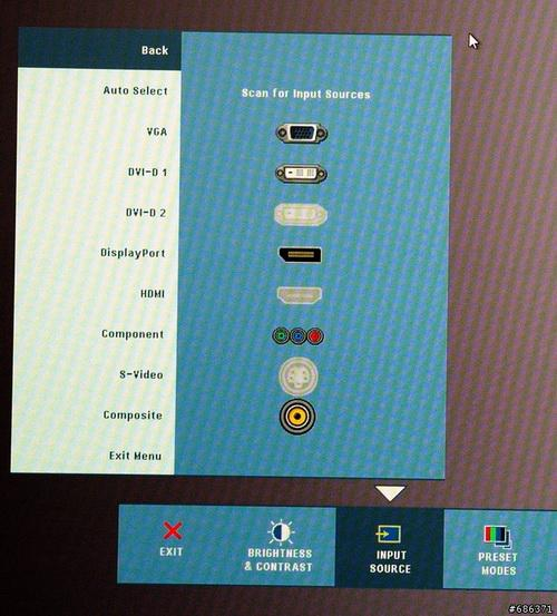 3008WFP的讯源分两组,DVI 1、DVI 2、HDMI、Composite、S-Video是一组,Displayport、D-Sub、色差是另外一组,DVI和HDMI无法做PBP有点小可惜。