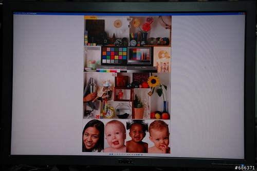 3007WFP的真实对比大约是800:1或900:1,由于是用S-IPS面板,加上规格表上117%超广色域,很多人一定很好奇它的颜色表现,一句话,真的超赞!画面非常自然柔和,渐层、细节、肤色都非常棒,绝对没有一般便宜屏幕过度拉高对比度,造成死白的现象,亮部细节都很清楚,只有因为对比不高,极暗的部分会些微流失,就算是出厂默认值也有相当饱满的颜色。不过大家一定觉得纯文本叙述不够贴切,所以我借了Spyder2 Pro(谢谢花大!!),看看3008WFP默认值的颜色与校正后的效果。