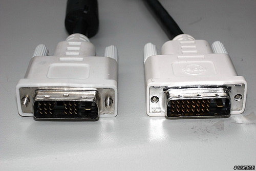 Single Link DVI(左)与Double Link DVI(右),中间多了六根针脚,传输2倍的画面数据。3008WFP附赠一条Dual Link DVI线。