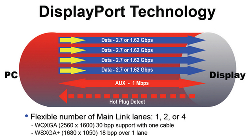 DisplayPort的技术是全部砍掉重练,虽然和HDMI一样是纯数字端子,但底层讯号改用PCI-Express,而不是Silicon Image独占的TMDS技术。用PCI-Express有诸多好处,PCI-E是以组合Lane信道的方式来增加传输带宽,所以DisplayPort的接头都长一样,但里面可以跑不同的Lane数来支持到不同的最高分辨率,最多可合并4条Lane,支持到2560x1600,但接头只比HDMI Type A(最高1920x1200)稍大一点点。