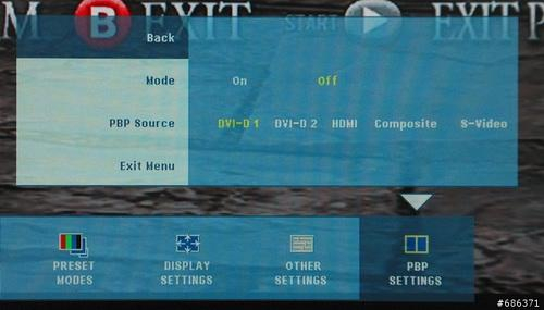 OSD里的PBP选项,不能在OSD里指定要显示哪两种讯源,只能先选一种,进到PBP之后,再按讯源快速切换键来选第二个。