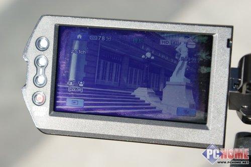 除了分辨率,这块XtraFine液晶屏同时还具有超过160度的宽视角并支持索尼新推行的x.v.Colour广色域色彩模式。不过我对索尼以前一些HANDYCAM产品的液晶屏幕在色彩方面的表现已经非常满意,索尼SR12E上的液晶屏在色彩方面并没有什么特别“惊艳”的感觉,只是觉得其色彩不是特别艳丽,而是走那种比较忠实还原真实色彩的路子。在这块屏幕上,我们同样能够找到方便用户操作(尤其是高或者低角度拍摄时)的录制/变焦按键。另外,在最上方还有一个房子图标的HOME按键,关于它的功能我会在后面做详细介绍。