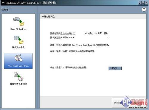 所有软件安装完毕后,重新连接索尼SR12E与PC,HANDYCAM UILITY软件会自动检测到摄像机,并开始统计摄像机内的文件总数。同时也会估算出这些文件的总容量以及用户目标文件夹的剩余空间。当然,用户也可以选择不导入文件到PC上,而是直接用ONE TOUCH DISC BURN(也就是一键刻录)功能直接把索尼SR12E内的内容烧录在光盘上。