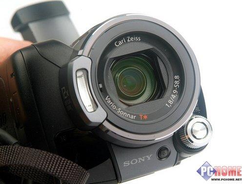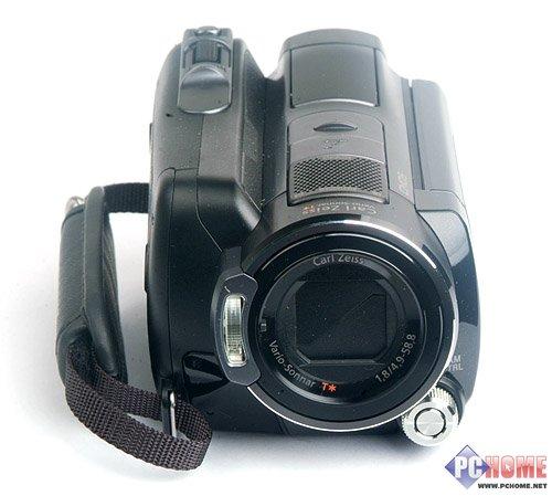 机身正面是一枚带有T*镀膜工艺的卡尔蔡司VARIO-SONNAR镜头,最大光圈是F1.8。对于索尼家用摄像机的蔡司镜头我们在过往的评测中已经做过很多介绍,这里就不再重复。不过让我觉得有些意外的是,索尼似乎并没有像其他厂商那样刻意提升/宣传镜头的变焦能力(相当于35mm镜头尺寸:动态模式:(16:9):40 - 480mm,(4:3):49 - 588mm,静态模式:(16:9):40 - 480mm,(4:3):37 - 444mm),而只是很低调的在机身侧面留下个12X的LOGO。我个人其实并不太看重摄像机的镜头变焦能力,一是因为10X左右的变焦已经完全能够满足日常使用需求(又不拿来做偷窥用),二是超长焦的DV镜头和数码相机一样同样会带来画质下降以及防抖的问题。事实上,大部分品牌的高端DV产品在变焦范围上都徘徊在10X左右,倒是很多低端入门机动辄20X甚至40X什么的,多少有点靠“偷窥”能力做噱头的意思。