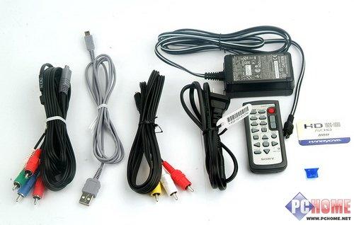 有关于全数字信号传输的问题我待会再说,先再来看看索尼SR12E包装盒内到底还有其他什么好东西。下面这张图表现的是除了底座以外的硬件配件,主要也就是各种线缆之类的东西。当然了,如果索尼真能在包装里面附送一根HDMI线我会感觉更超值的。画面右侧那个带有HD字样的小纸牌其实是靠不干胶黏贴在主机上的广告牌,我当然是第一时间就把这个玩意给扯下来了。:)