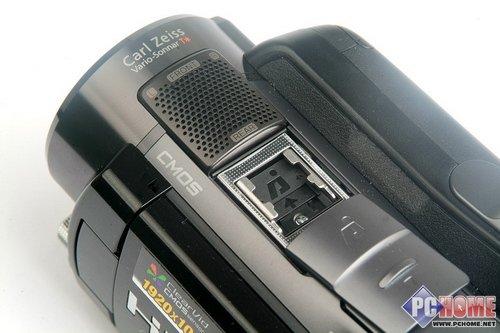 索尼SR12E机身顶部为5.1声道的内置变焦MIC,关于这个部件的效果我会在后面做单独介绍。其后推开一块滑盖,便能找到索尼摄像机专用的外接辅助光源的热靴接口。在家用DV上使用这个部件的用户非常少,我在这里并不做太多展开。
