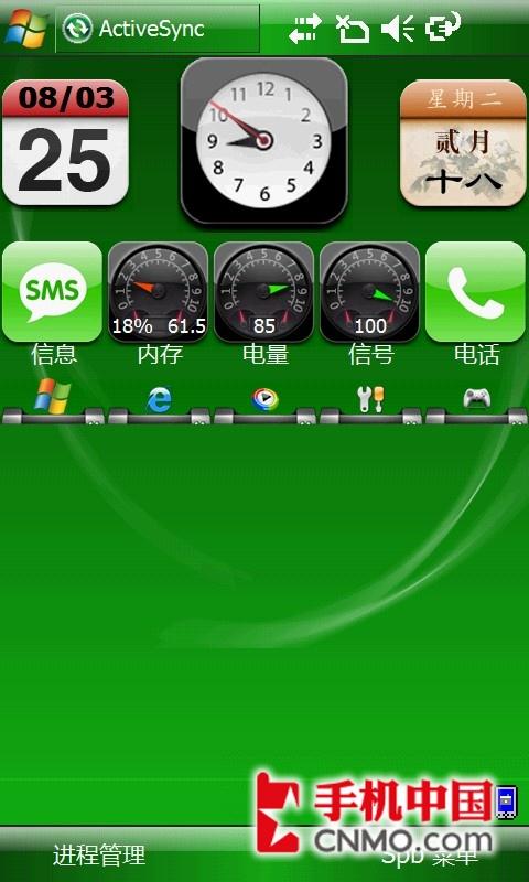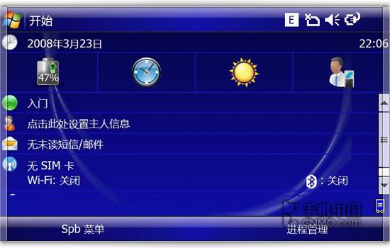 SpbMobileShell 2的发布引发了Windows Mobile手机桌面插件的革命。这款实用的桌面插件将多页面滑动操作和3D切换效果收入囊下。很高兴东芝G900可以完美支持这款软件,图标和字体都相当完美。更爽的是,该机由于反应速度慢,因此SpbMobileShell的3D切换效果仿佛被拖慢了一倍,这样就让我们可以更细致的欣赏3D效果……