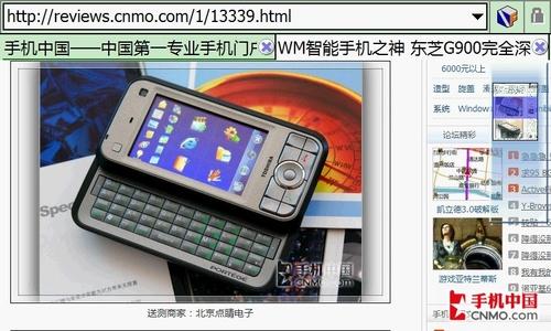 东芝G900的屏幕上网太爽了!800像素的屏幕宽度可以整屏显示多数网页。当然鉴于G900整机的反应速度,想用内置的IE浏览器上网的人肯定会被逼疯。举个例子,打开手机中国首页后,如果我想把视图模式由“桌面”切换到“适应屏幕”的话,大概需要给G900留出3分钟的反应时间……