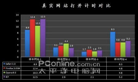 【简评】 通过对真实的网站加载计时,我们同样可以得出上面的结论。Safar 1.3在应对大多数网站环境时,均能以较高的浏览速度胜出。而Opera 9.5与Firefox 3.0 Beta 4,则在各项测试中,互有胜负。至于鼎鼎大名的IE7,仍然没有摆脱“垫底”命运。但整体速度,已和主流浏览器相差不多了。