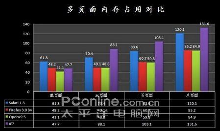 【简评】 从上面的测试中可以看出,Firefox 3.0 Beta 4与Opera 9.5在多页面内存占用对比中,仍然不相高下。无论是单页面,还是多页面,几乎占用了相同的内存资源。而Safari 1.3在这一环节的对比中,表现却很一般。整体占用要较前两款浏览器,大上很多。至于IE7嘛,和大家印象中一样,依旧垫底。