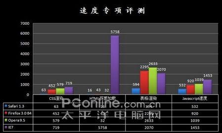 对于一款浏览器来说,影响其速度的因素很多。既有来自于其自身渲染引擎(Layout Engine)的原因,也和用户的接入网速度及网站负载有关。因此,我们将首先通过专业网站,分别对浏览器的CSS渲染、HTML调用、表格渲染、Javascript速度四项内在指标,进行一番真实评测,如图13所示。