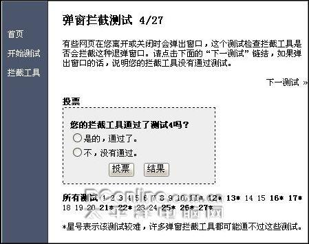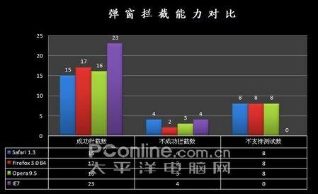 【简评】 在广告拦截能力的对比中,Safari 1.3的表现并不理想,总成绩在三款非IE核心浏览器中最差。相对而言,Firefox 3.0 Beta 4成绩最好,在总共的19项可支持评测中,共成功地拦截了17项。而名气最“大”的IE7,由于总支持测试数为27项。因此,实际上它的23项“成功拦截”成绩并不算高,折算后基本与Opera 9.5属同一档次。