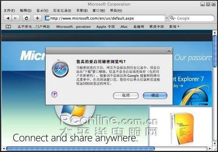 此外,在Safari 3.1中,我们还见到了一些其他浏览器所不具备的功能。就拿这个“秘密浏览”来说吧,当我们在公共电脑上网时,总会担心自己的个人信息,会不小心遗留到所用电脑上。而如果进入“秘密浏览”模式,包括“历史记录”、“搜索关键词”、“用户密码”、“下载文件”等在内的所有个人文件,均不会被浏览器自动保存。除此之外,像“自动填表”、“RSS阅读”、“下载管理”、“快速回退”等一些主流浏览器必备的功能,如今也都能在Safari 3.1中找到了,如图1所示。