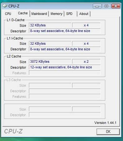 Q9300的CPU-Z检测信息。由以上截图我们可以看到,Intel Core 2 Quad Q9300的核心研发代号为Yorkfield,采用45nm制程工艺生产,C0步进,支持SSE4.1多媒体指令集,2x3M的二级缓。