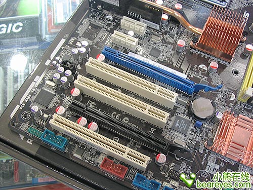 扩展部分,这款主板提供了6个SATA2接口,支持RAID 0、1、5和10,为方便用户的兼容需求,还提供了一个IDE接口,方便接驳光驱和PATA硬盘。扩展接口方面,板提供了两条PCI-E X16独显插槽,使用Crossfire双显卡模式时,PCI-E X16插槽的速度仍然维持P965时代的“X16 + X4”,此外,它还提供了3条PCI插槽以及2条PCIE X1插槽。