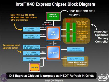 可以这么说,X48芯片组的发布完全是为了支持1600Mhz FSB和1600Mhz内存频率。一方面是为了能够完美支持已于今年1月出现的QX9750处理器。另一方面,增加双通道DDR3 1600MHZ是为了缩小它和nVIDIA 790I芯片组在规格上的差距。但目前为止,普通消费者无法购买到400Mhz外频的QX9750处理器,同时购买价格昂贵的高频率DDR3内存并不现实(这也是主板厂商更热衷于生产DDR2版本X48主板的原因)。在这样的背景下,购买价格要低廉许多的X38主板对于DIY超频玩家更具现实意义。