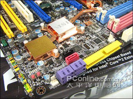 点评:我们知道,X38主板仅提供两条PCI-E插槽,支持双卡交火,和AMD平台的四卡交火相比略微逊色。为了实现四卡交火功能,微星X38白金版通过桥接第三方芯片额外提供两条PCI-E插槽,从而实现四卡交火的功能。当然,这款X38主板也比同级别的X38主板要贵不少。