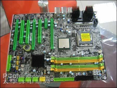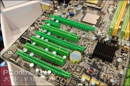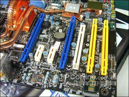主板提供3条PCI-E显卡插槽,分别工作在16X+16X+4X模式下,支持交火。另外,它还提供了一条PCI-E X1和3条传统的PCI插槽。