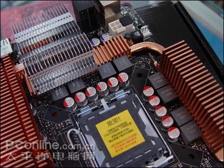 微星 X38 Platinum的处理器供电部分,采用了超豪华的八相供电回路设计,使用高品质的全固态电容、R50全封闭式电感和低电阻晶体管,并且采用CIRCU-PIPE热导管散热系统,用料十分奢华。