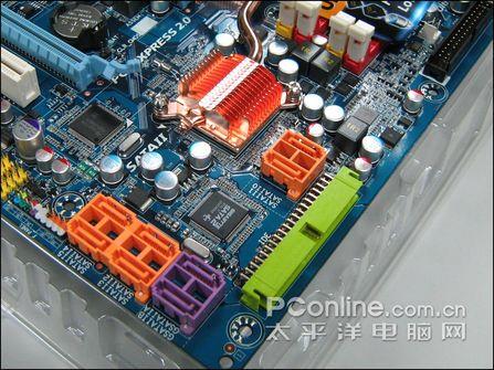 主板上的ICH9R南桥,提供6个SATA2接口,支持RAID模式。另外,它还整合第三方芯片,提供额外的两个SATA2接口和一个IDE接口。