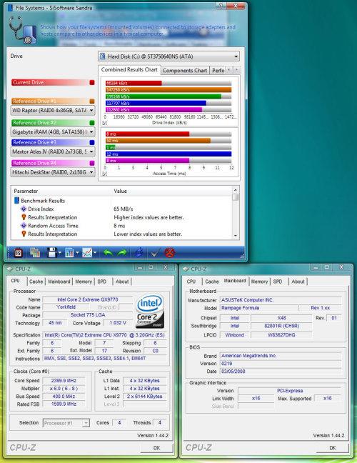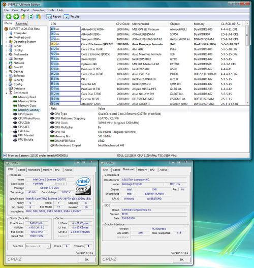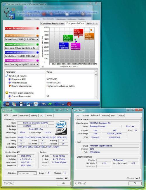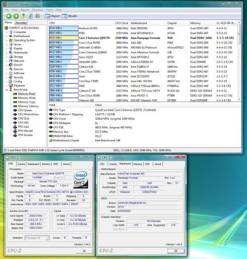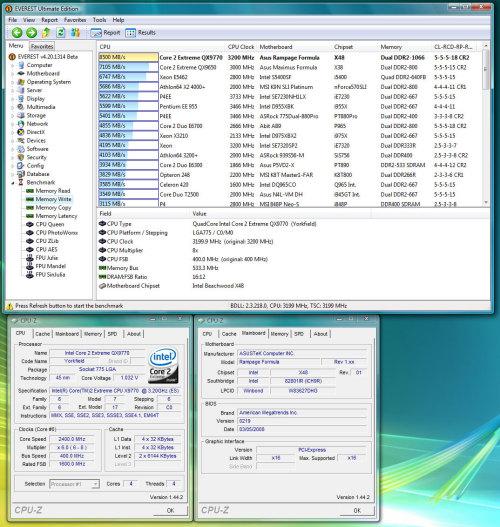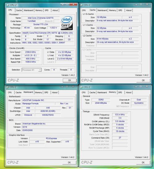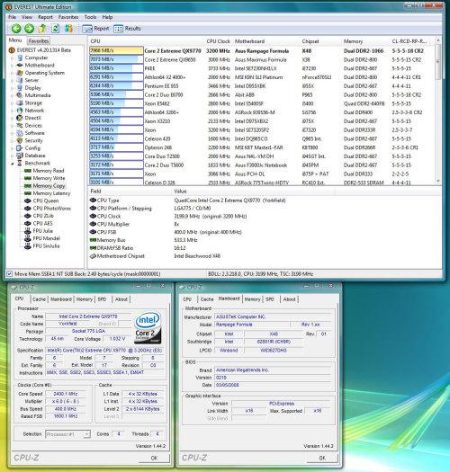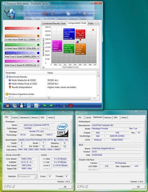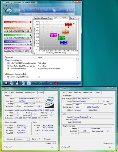 由以上测试截图我们可以看到,超频之后无论是处理器的运算能力还是系统的内存带宽均得到了很大幅度的提升。尤其是在系统内存带宽方面,尽管超频后内存是运行在DDR2 1000MHz的频率之上,但由于与处理器外频同步,使得系统的内存性能得到了充分的发挥,从而获得了比Intel QX9770平台更为出色的性能。
