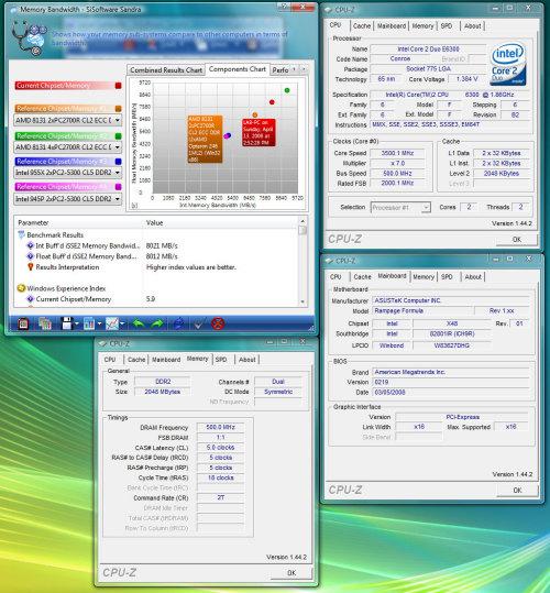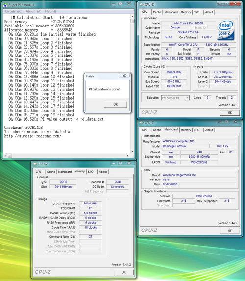 强劲的超频能力是这款华硕Rampage Formula主板最大的卖点之一,因此我们会考察其在超频方面的表现。测试超频使用的是ConRoe E6300处理器,可以在不加电压的情况下将处理器外频轻松超频至500MHz,最多能够将内存异步至DDR2 1000MHz的频率上,以下是超频之后运行Super Pi、Sisoft Sandra的得分截图。