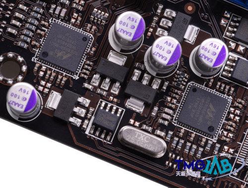 音频部分,华硕Rampage Formula并没有在PCB板上提供外接音效芯片,而是提供外接的SupremeFX II声卡。为了使玩家能够在日常应用中得到最好的音质以及在游戏中得到最好的临场感和声场,华硕将通常集成在主板上的CODEC独立出来,放在了一款单独的PCB上,利用PCI-E x1接口于主板进行链接。这样的好处是显而易见的,把CODEC独立出来可以避免其音质收到主板上面众多的电磁干扰的影响,而且独立出来的CODEC和音频接口更容易进行布线和元件安装,并可以安装完整的滤波电路和供电部分,使得声卡的音效完全可以媲美独立声卡。