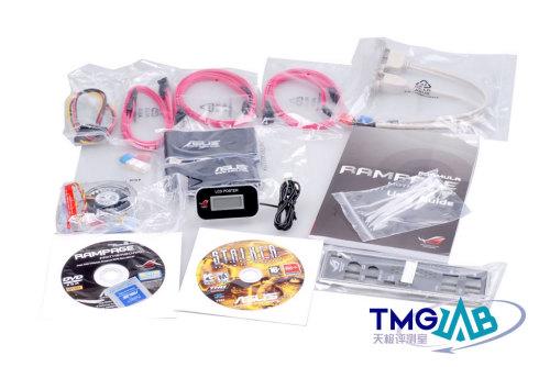 华硕Rampage Formula附送的附件种类非常丰富,并且非常具实用价值,同时还充满了人性化的设计。除了各种ATA连线、电源线以及主板驱动光盘和游戏之外,华硕Rampage Formula还提供了可以发光的主板挡板,方便在不开灯的昏暗房间内也可以让玩家清晰的辨认各种接口。华硕还提供了一个小风扇,帮助场效应管的散热,而且噪音也不是很大。主板还赠送了一个小液晶显示器,接在主板上可以实现诊断卡的功能,同样可以使玩家在不打开机箱的情况下了解计算机运行的情况。
