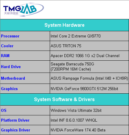 为了能更全面、清楚的了解华硕Rampage Formula各方面的性能表现,测试软件方面,我们选择3DS MAX9、CineBench10 SMP Render、Sisoft Sandra XIIa来测试处理器的性能;选择PCMark Vantage来测试系统的整体性能表现;选择3DMark06、Company of Heroes、Call of Juarez和World in Conflict来测试系统的3D性能,3D性能测试中采用1280x1024分辨率。