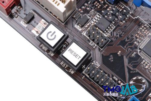 在主板的下方特别为喜爱超频的玩家设计了电源和重启按钮,方便玩家在打开机箱进行调试的时候开关机和重启,充分体现了华硕玩家国度系列主板的精准定位。这项功能虽然实现起来非常简单,但是长时间以来一直被绝大多数厂家所忽略,而华硕对细节的注重的确令人称赞。