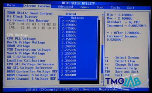 处理器电压的调节范围为1.1V-2.4V,在1.1V-1.9V范围内,电压以0.00625V为步进,在1.9V-2.4V范围内,电压则是以0.025V为步进。
