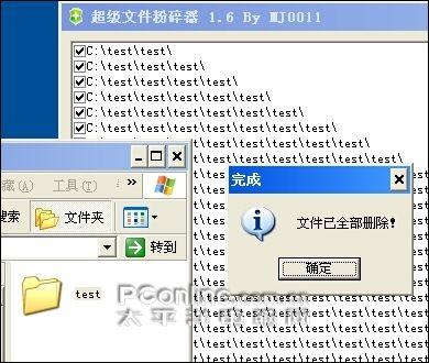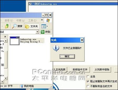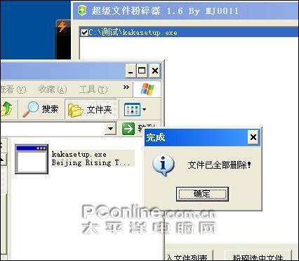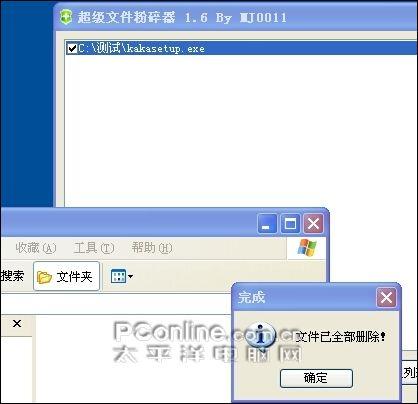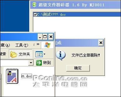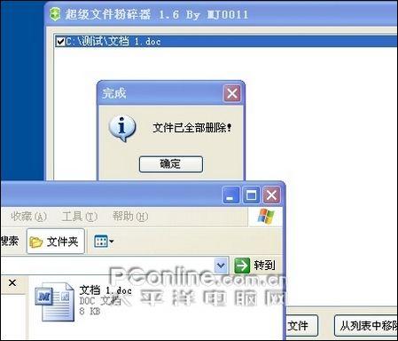 1)360超级文件粉碎器删除提示成功,然后刷新目录查看文件依然存在。重启动系统后文件才会删除(如图1)。