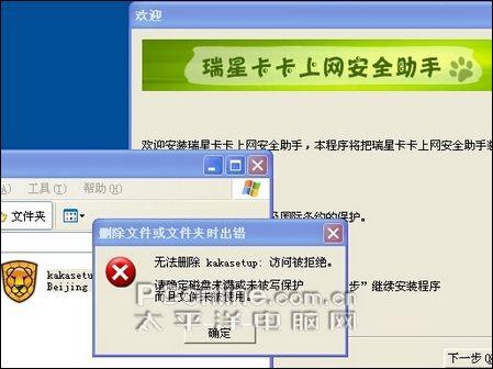 构造测试方法,运行瑞星卡卡助手,在软件运行的状态下尝试删除,系统提示无法删除(如图3)。