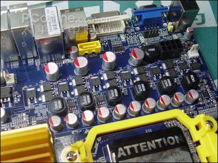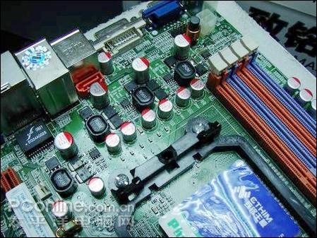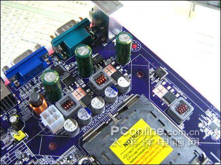 5P31G对于次要的内存和显卡电路都尚且如此重视,更不用说对整机正常运作和超频性能有重大影响的CPU供电部分,从图中可见在LGA775插槽附近就整齐排列着全固态的电容,根据不同阻抗和电路运作不同的位置,别出心裁的选用了不同大小和容量的固态电容,在加上三位一体的电感和MOS管,从里到外,从CPU到I/O部分的稳定问题都不用担心了。