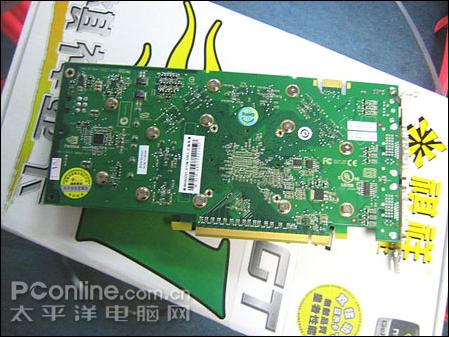 公版设计的显卡背部的做工与用料都是十分优秀的,当然能够提升性能所使用的SLI双卡互联接口是必不可少的,对于一款售价不高的9600GT产品来说,双卡组SLI的性能完全能超越现在的单核王9800GTX,而且售价更低。